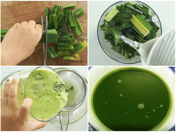 Cắt nhỏ lá dứa (lá nếp), cho vào máy xay sinh tố và xay nhuyễn cùng với khoảng 100 ml nước lọc. Tiếp theo, đem hỗn hợp lá dứa vừa xay lọc qua rây để lấy nước cốt.