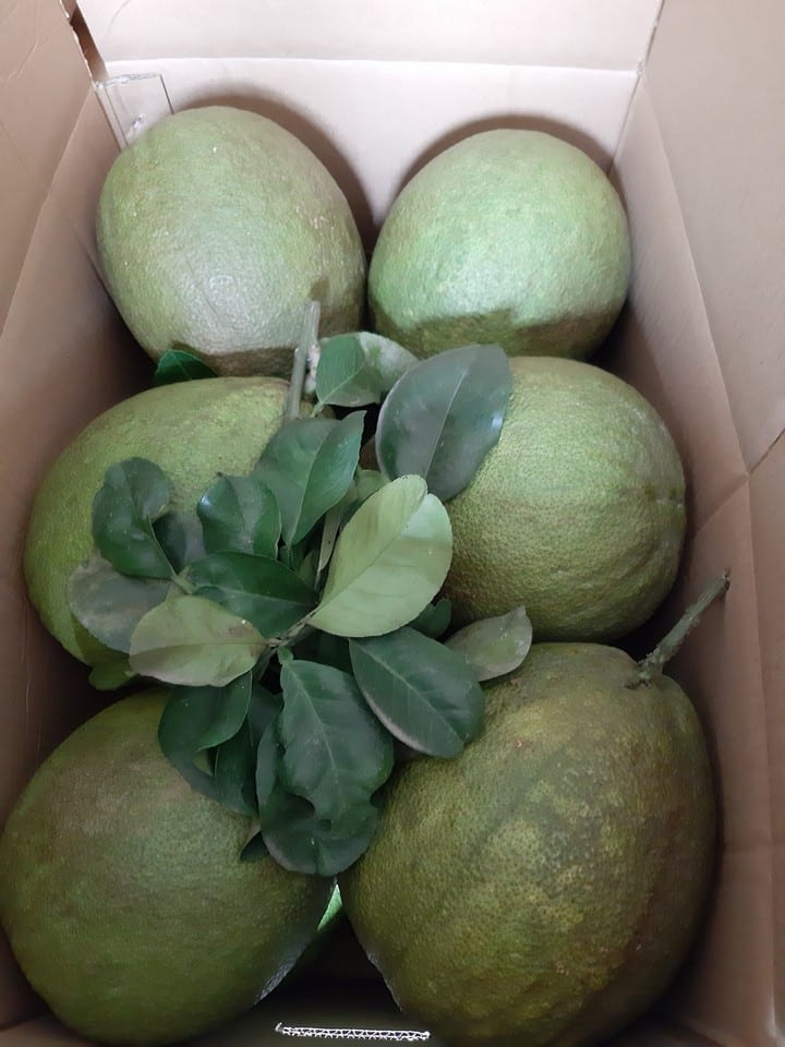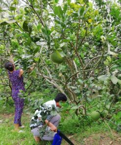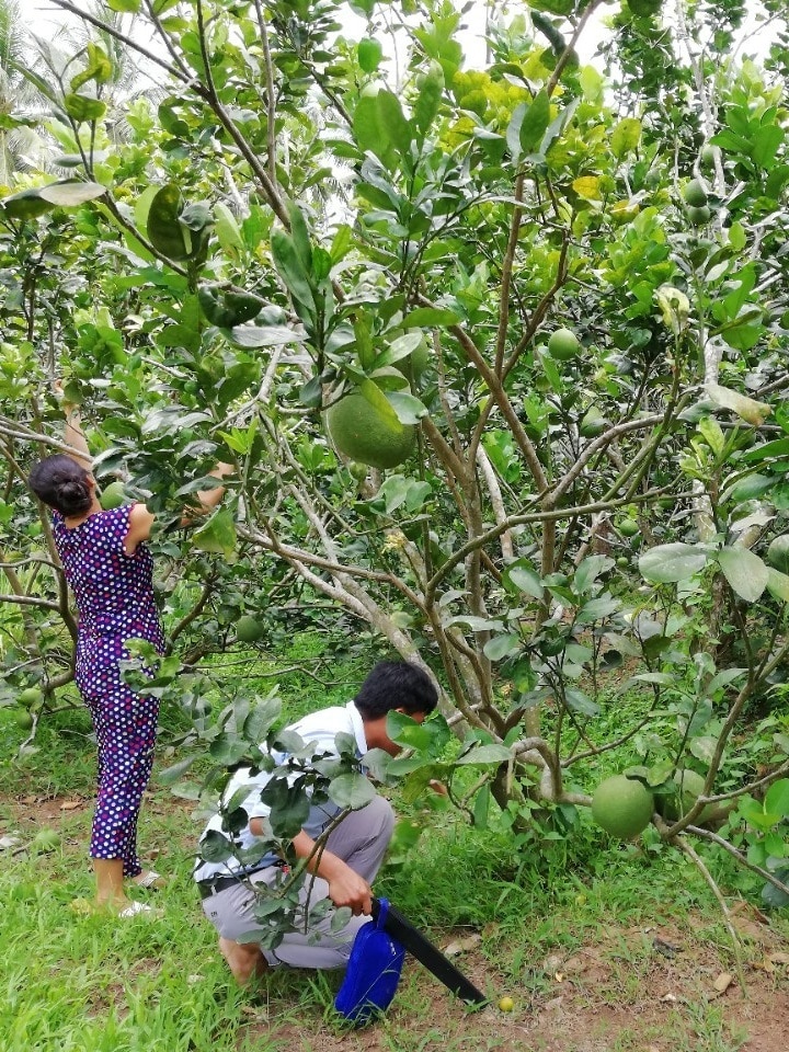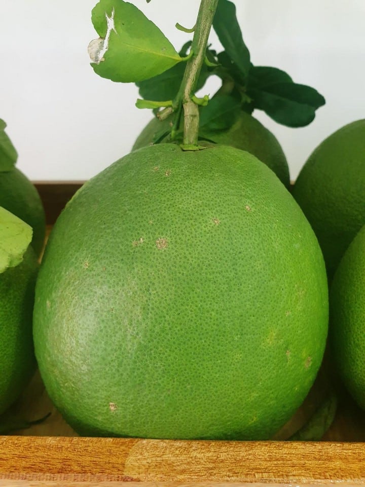 - Bưởi da xanh nhà vườn Ngô Long Thọ trái tròn đều, vỏ mỏng, thịt mọng nước, vị chua nhẹ.