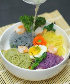 Mỳ gạo ngũ sắc (mỳ rau củ) Xuân Trường là mỳ được đặt riêng, tạo ra từ sự kết hợp từ gạo Bao Thai đặc sản, thơm ngon nguyên chất với các loại lá, củ, quả như gấc, mè đen, chùm ngây, gạo lứt, nghệ. Tôi, tráng 2 lần nước, phơi 2 lần nắng, nấu bằng củi, hoàn toàn thủ công. Nói không với mỳ công nghiệp.